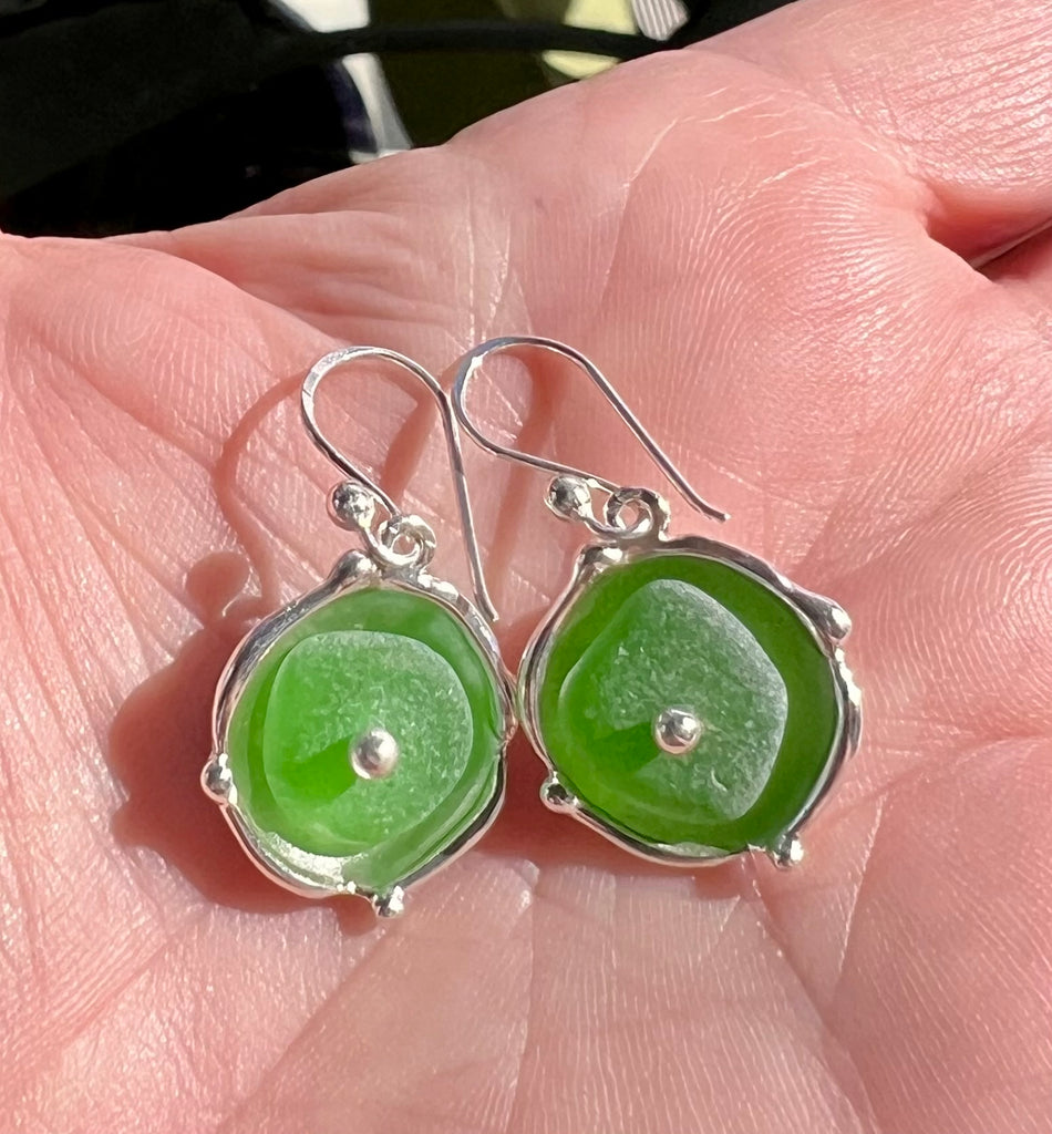 Sterling silver cast round discs reflect these pieces of authentic green sea glass from the beaches of Hawaii. (dimensions: 3/4" x 1 1/4")