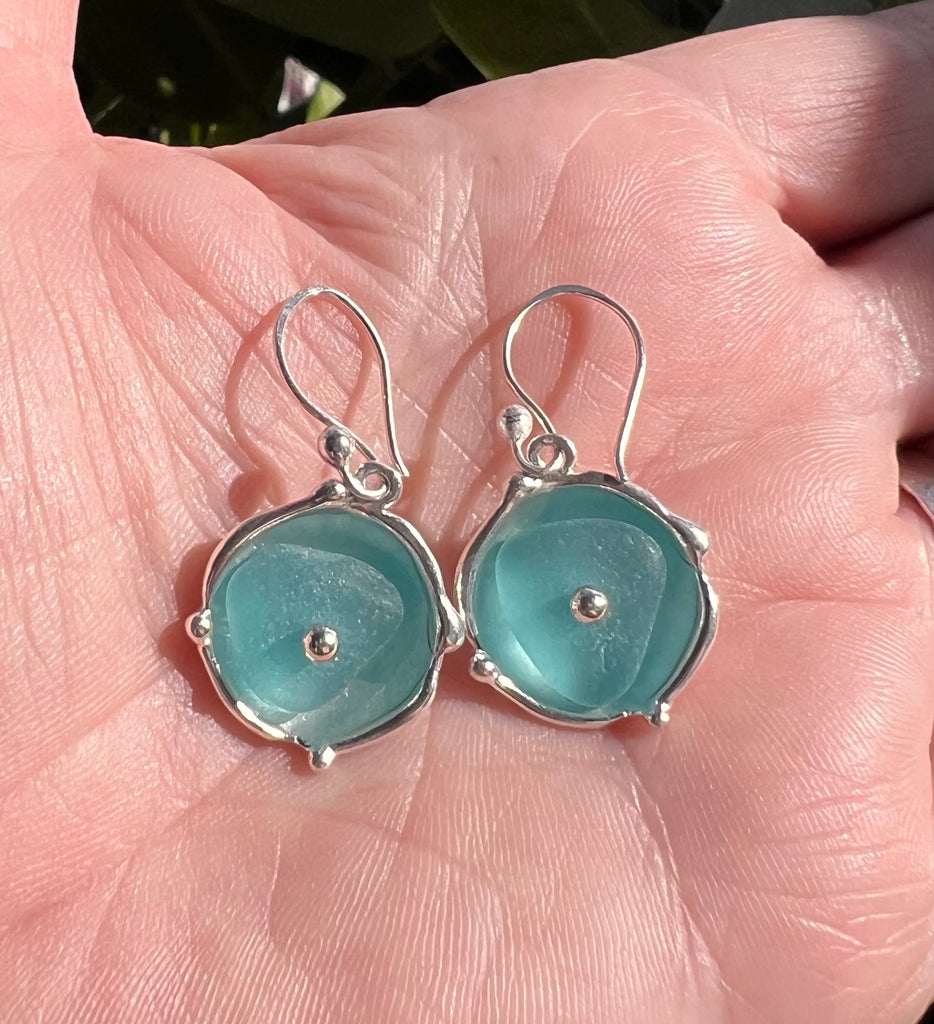 Sterling silver round domed earrings reflect these pieces of authentic brilliant turquoise sea glass from the beaches of Hawaii. (dimensions: 3/4" x 1 1/4")