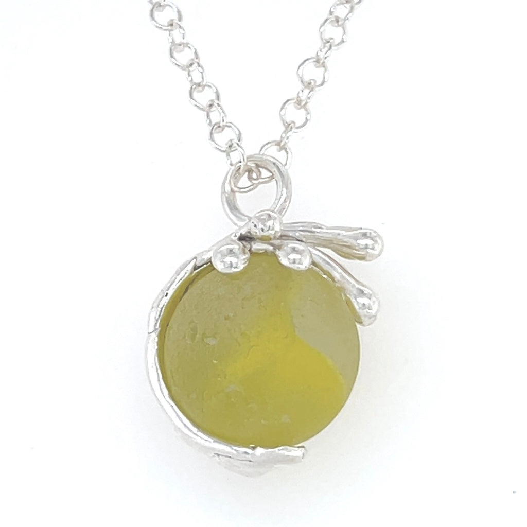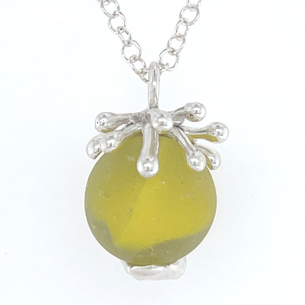 Bring some sunshine into your day with this stunning yellow sea glass marble that actually spins inside it’s one-of-a-kind sterling silver splashing wave, so it’ll add a little fun to your day. (pendant diameter: 3/4" x 7/8"). If you go to my Instagram page @ingridlynchseaglassjewelry you’ll find a video showing how the marble spins inside its splashing wave. *marble on the model is to show how it sits