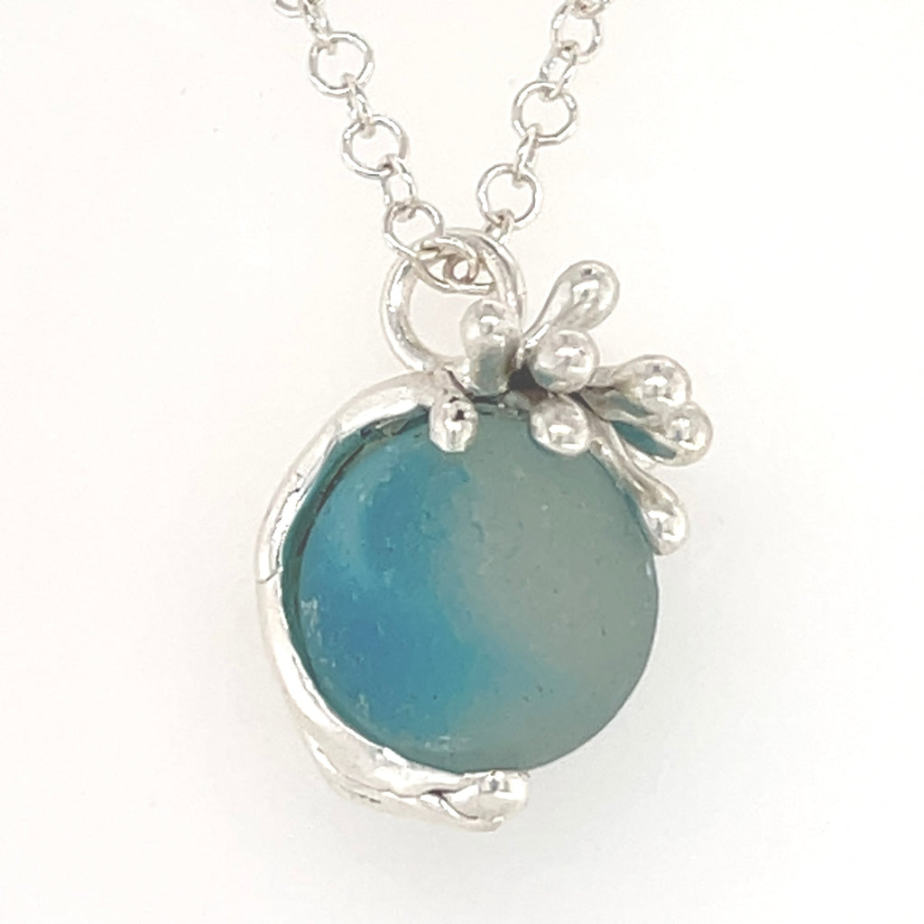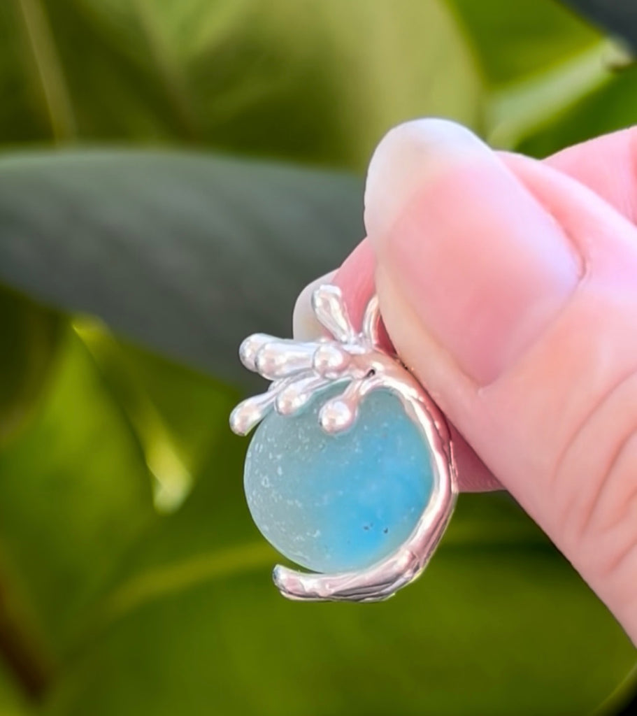 Bring some fun into your day with this aqua cat’s eye sea glass marble that actually spins inside it’s one-of-a-kind sterling silver splashing wave. (pendant diameter: 3/4" x 7/8"). If you go to my Instagram page @ingridlynchseaglassjewelry you’ll find a video showing how the marble spins inside its splashing wave. *marble on the model is to show how it sits