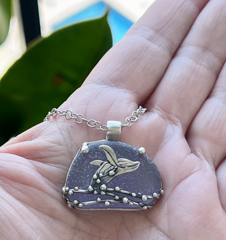 Hand-carved sterling silver one-of-a-kind necklace with breaching humpback over splashing waves that surrounds this spectacular rare purple genuine sea glass from Japan. 18” round cable sterling silver chain. (pendant dimensions: 7/8” x 1.25”)