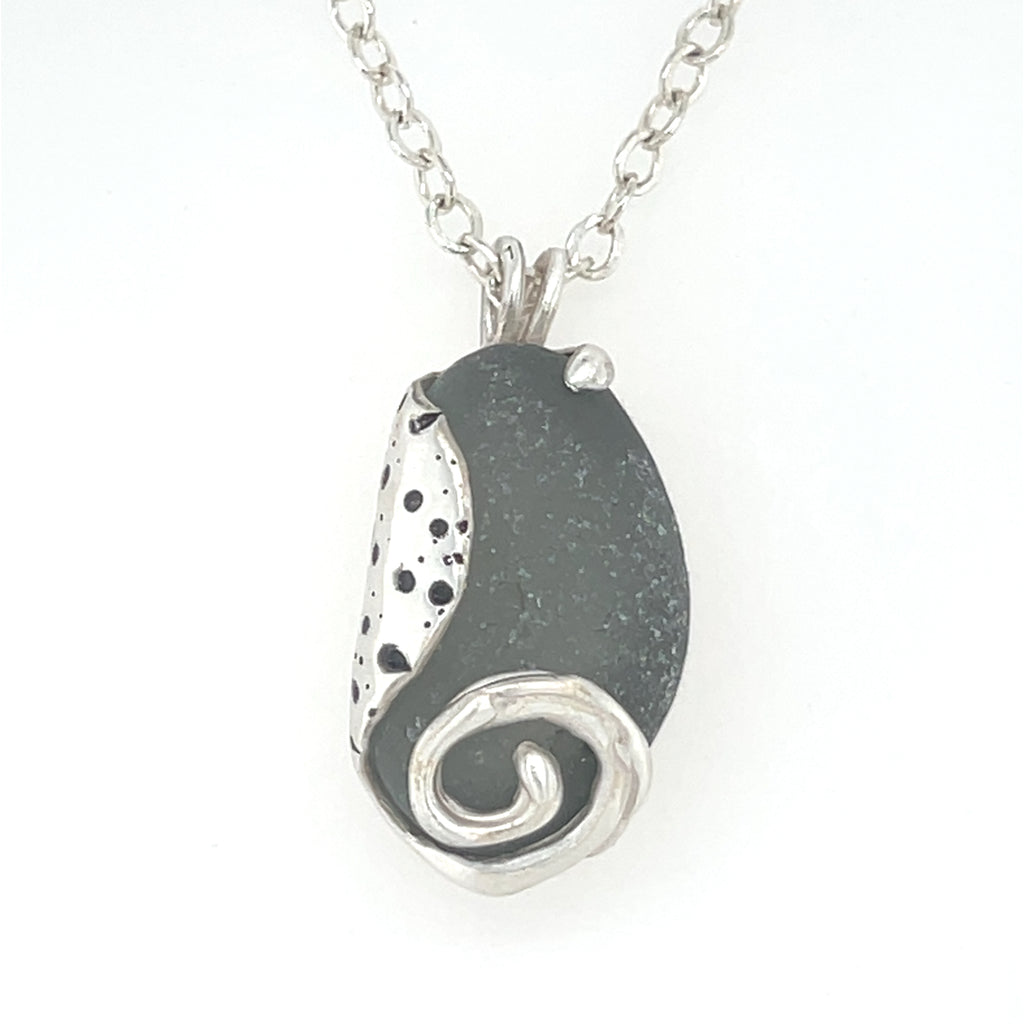 One-of-a-kind sterling silver sophisticated, yet whimsical, swirl necklace with urchin pattern surrounds this gorgeous grey genuine sea glass from Spain. 18” oval cable sterling silver chain. (pendant dimensions: .75” x 1.25”)