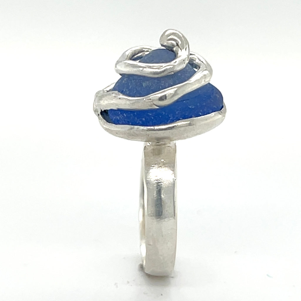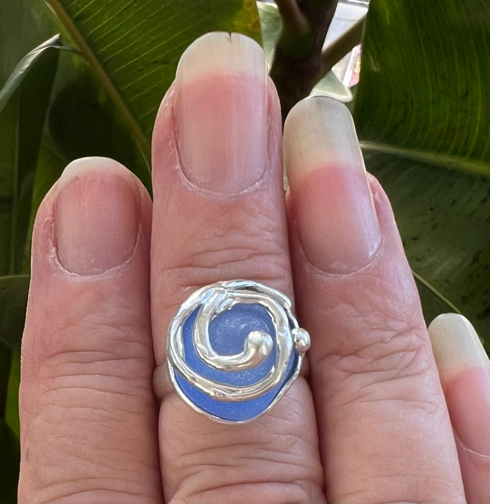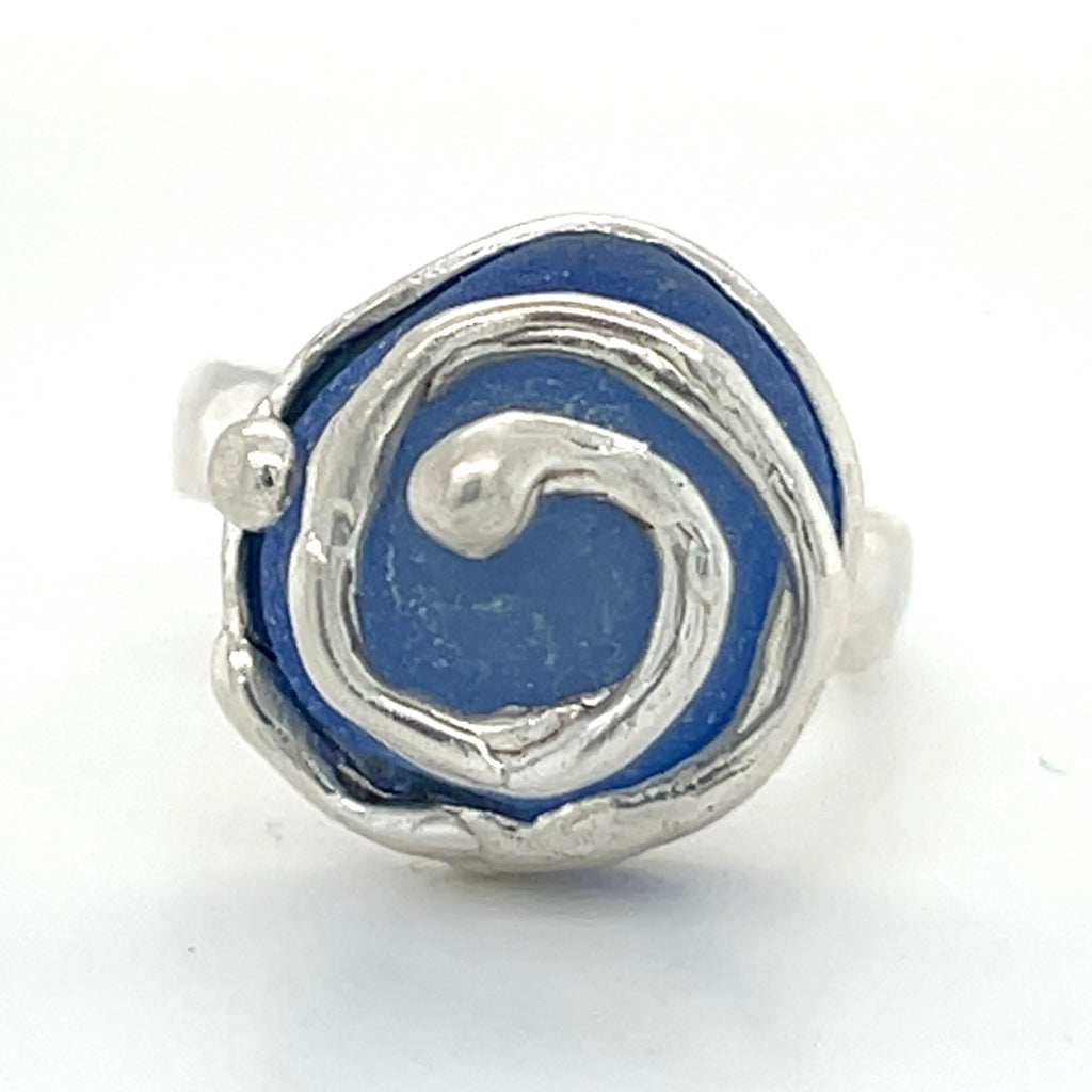 Sterling silver one-of-a-kind ocean swirl ring with cornflower blue authentic sea glass. (size: 6.5)