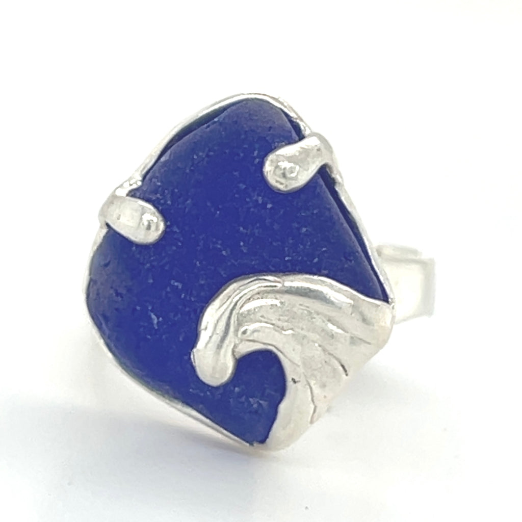 Sterling silver one-of-a-kind ocean wave ring with authentic cobalt sea glass. (size: 7.5)