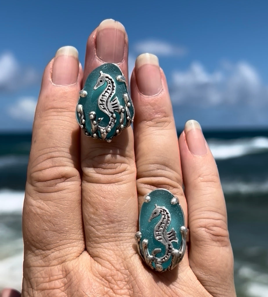 Sterling silver one-of-a-kind sea horse ring with ocean splashing bubbles on luscious turquoise authentic sea glass found on the shores of Japan. (size: 6.5)